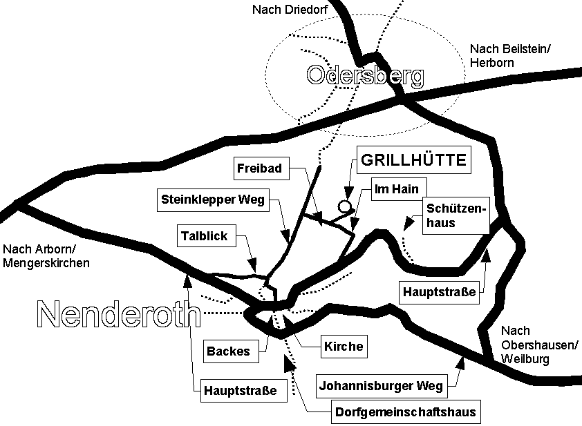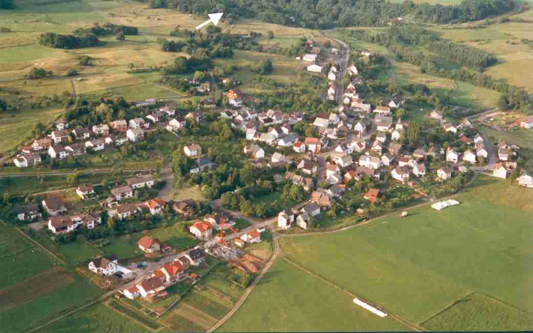 Die Lage der Hütte (Pfeilspitze) im Luftbild (Sicht auf Nenderoth vom Südwest): Die Hütte ist nicht zu sehen, weil um den Grillplatz Bäume und Büsche stehen.